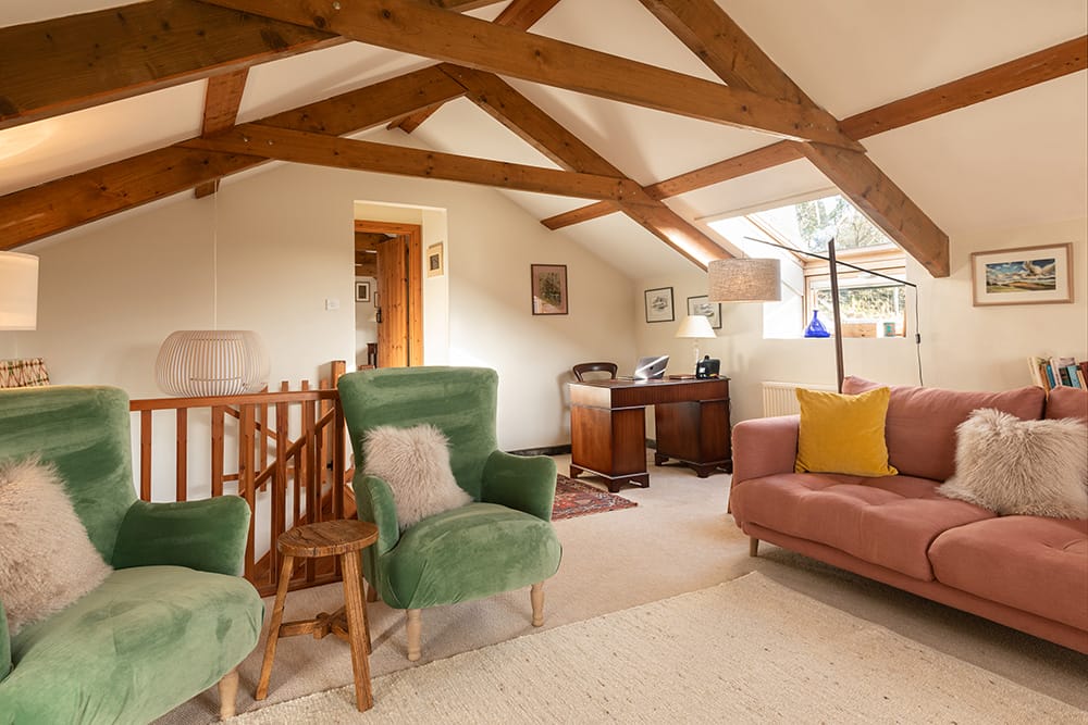 Accommodating up to 11 comfortably, there are 4 spacious bedrooms, 2 with en-suite and 2 family bathrooms, spacious kitchen diner, living room, snug, three wood burning stoves. The house is superbly equipped with everything and more, including a private study space with desk.